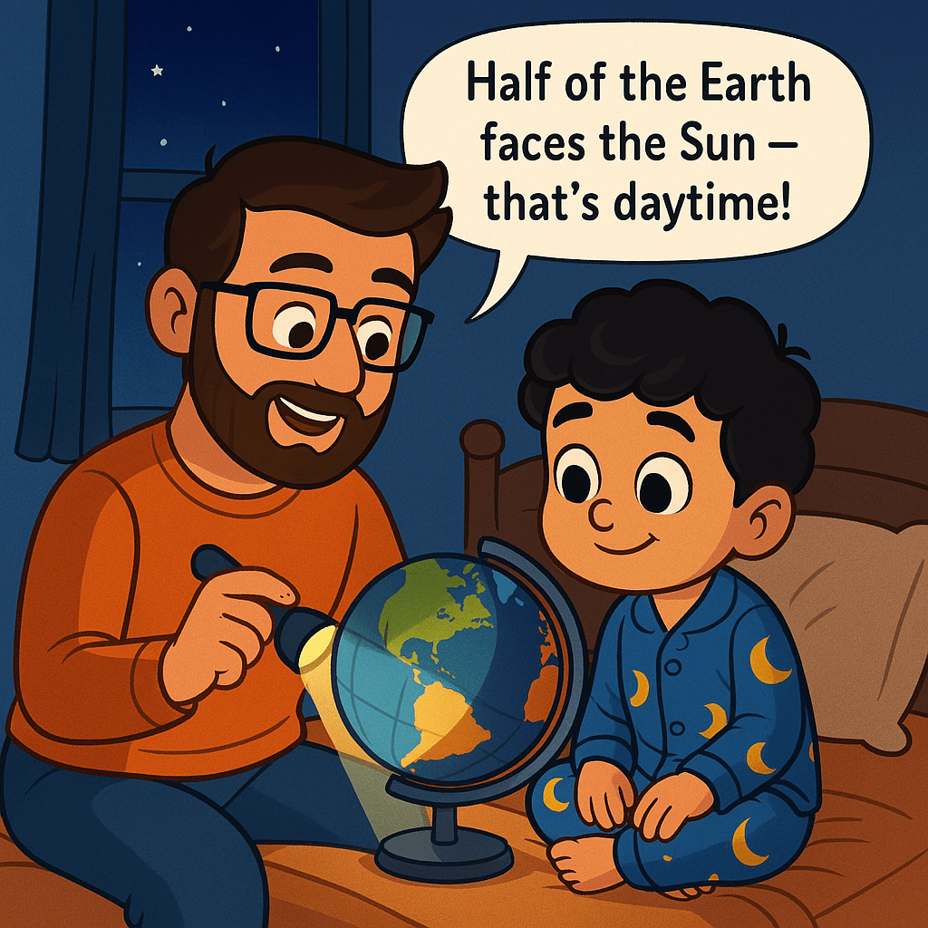 “Let’s pretend the Sun is like a big flashlight shining on one side of the Earth. The side that faces the Sun gets light — that’s daytime! But the other side is in shadow — that’s nighttime!”
