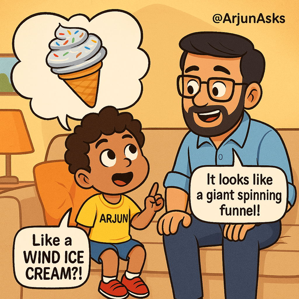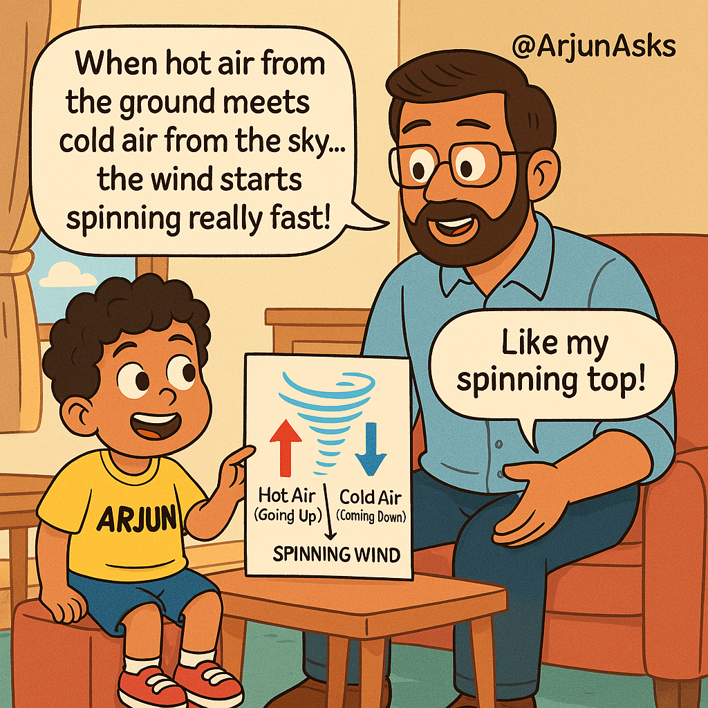 “Haha, not quite, Arjun! A tornado is like a super fast spinning tunnel of wind that comes down from a storm cloud and touches the ground.”