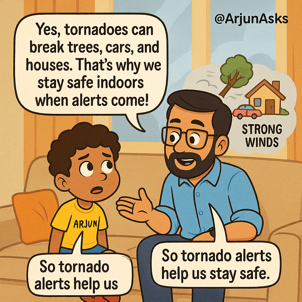 “Yes, buddy. Tornadoes can break trees, houses, and cars. That’s why we stay safe indoors or in tornado shelters when there’s a warning.”